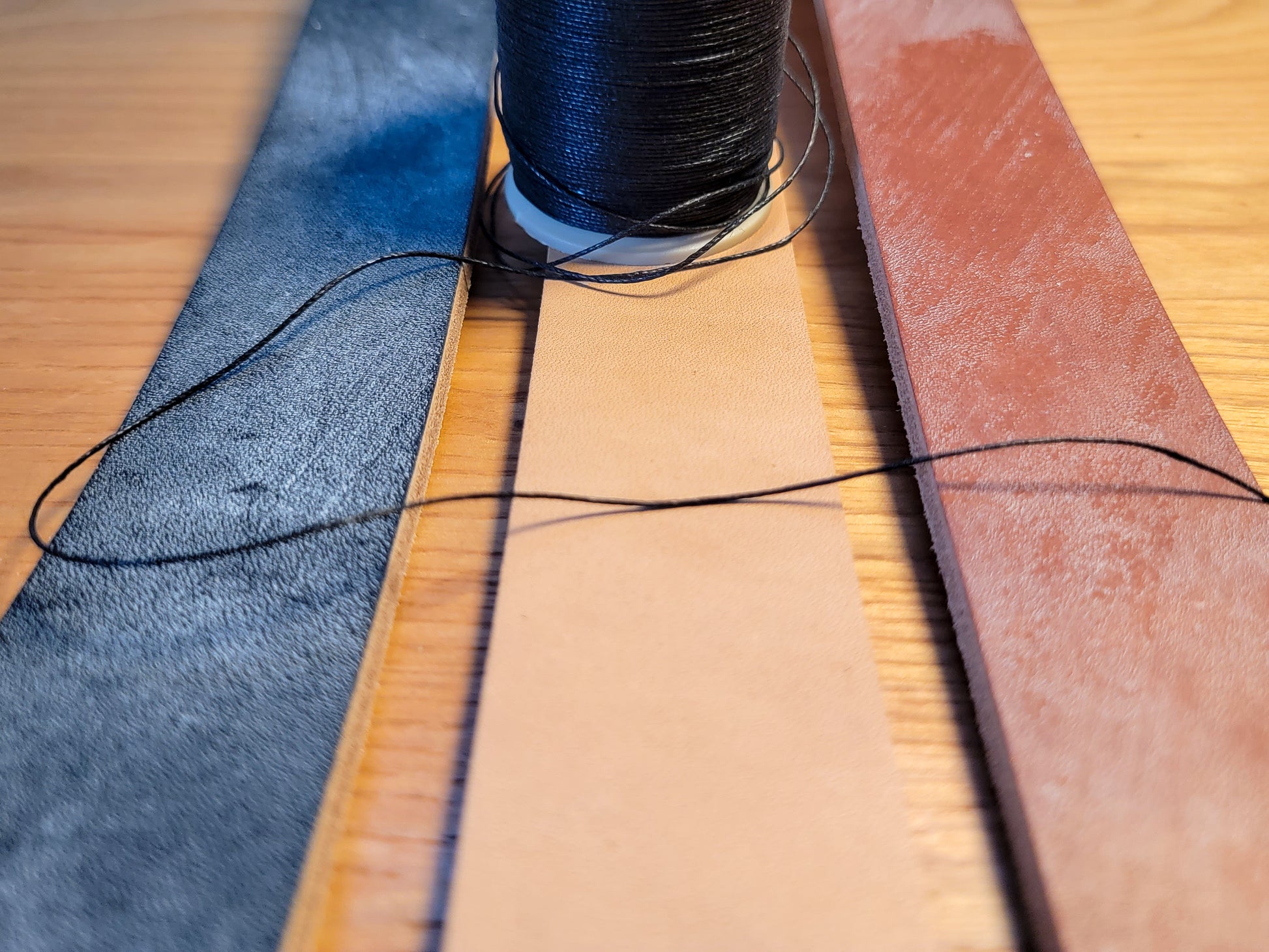Saddle-stitched by hand with linen thread. The edges are sanded and burnished through three (or more) grits of sandpaper, then creased and waxed to seal and protect. The stitched-in keeper uses a traditional bridle-work technique. Paired with a solid brass West End buckle cast at an English foundry.